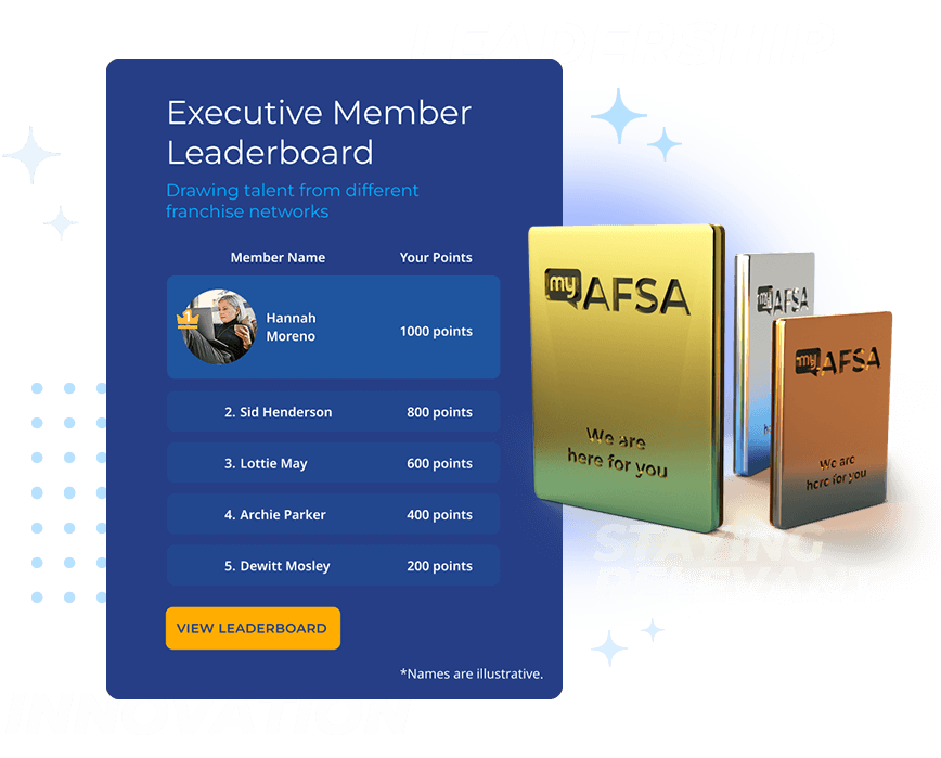 Are you someone determined to make their mark? Dynamic and focussed? Shape the franchise industry, elevate your profile and brand: join MyAFSA’s one-of-a-kind Executive Membership cohort today. Places are limited to 6 in each region/state. Our leaderboard will track your EM content (videos etc.,). Contribute more, gain more.